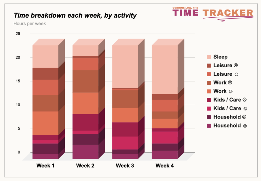 If you're trying to dedicate more time to activities that bring you joy and meaning, this tracker lets you your own time over a month to distinguish between high-value work, leisure, household, and kid time, and time that leaves us feeling depleted or disappointed. The graphs at the end will let you visualize how your time evolves over a month as you experiment with shifting the balance among different activities. More information on how to use and get the most out of the time tracker is in Chapter 8 of Having It All!