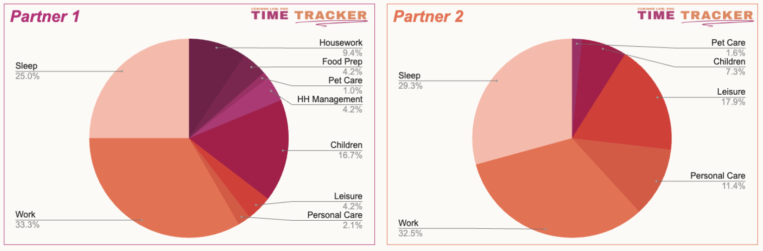 If you think you might need to rebalance the household load, this tracker gives you data to start the conversation. Track your time with your partner for one week to assess the balance of housework, childcare, leisure, and work in your relationship. The graphs will give you a breakdown of which tasks might be invisible to one partner, and what might need to shift. More information on how to use and get the most out of the time tracker is in Chapter 8 of Having It All!